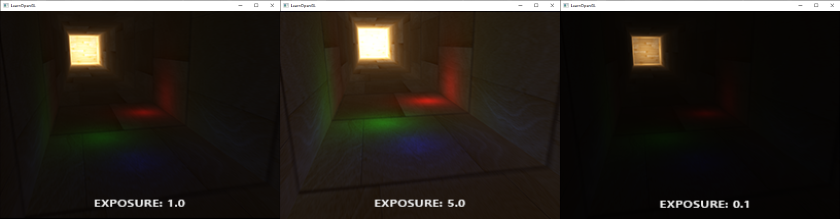 Эти изображения явно показывают преимущества hdr рендеринга. При изменении уровня экспозиции мы видим больше деталей сцены, которые были бы потеряны при обычном рендеринге. Возьмите для примера конец туннеля - с нормальной экспозицией текстура дерева едва видна, но при низкой экспозиции текстуру превосходно видно. Аналогично, при высокой экспозиции очень хорошо видны детали в тёмных областях.