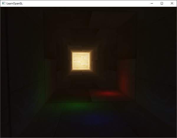 Здесь значения цвета, содержащиеся в буфере цвета, могут быть больше 1. Для этой статьи была создана сцена с большим вытянутым кубом, выглядящим как туннель с четырьмя точечными источниками света, один из них расположен в конце туннеля и обладает огромной яркостью.