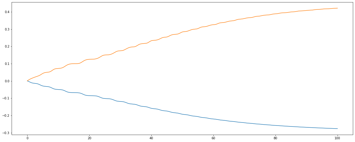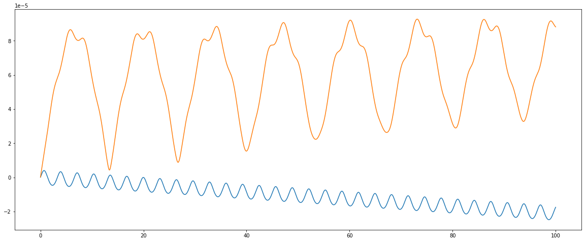 Советую обратить внимание на масштаб. Относительная ошибка составляет 0.0001 от L, кинетическая энергия осцилирует слабее, но решительно и неутомимо растёт.