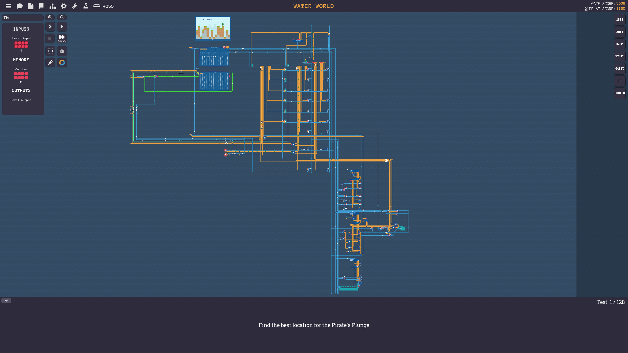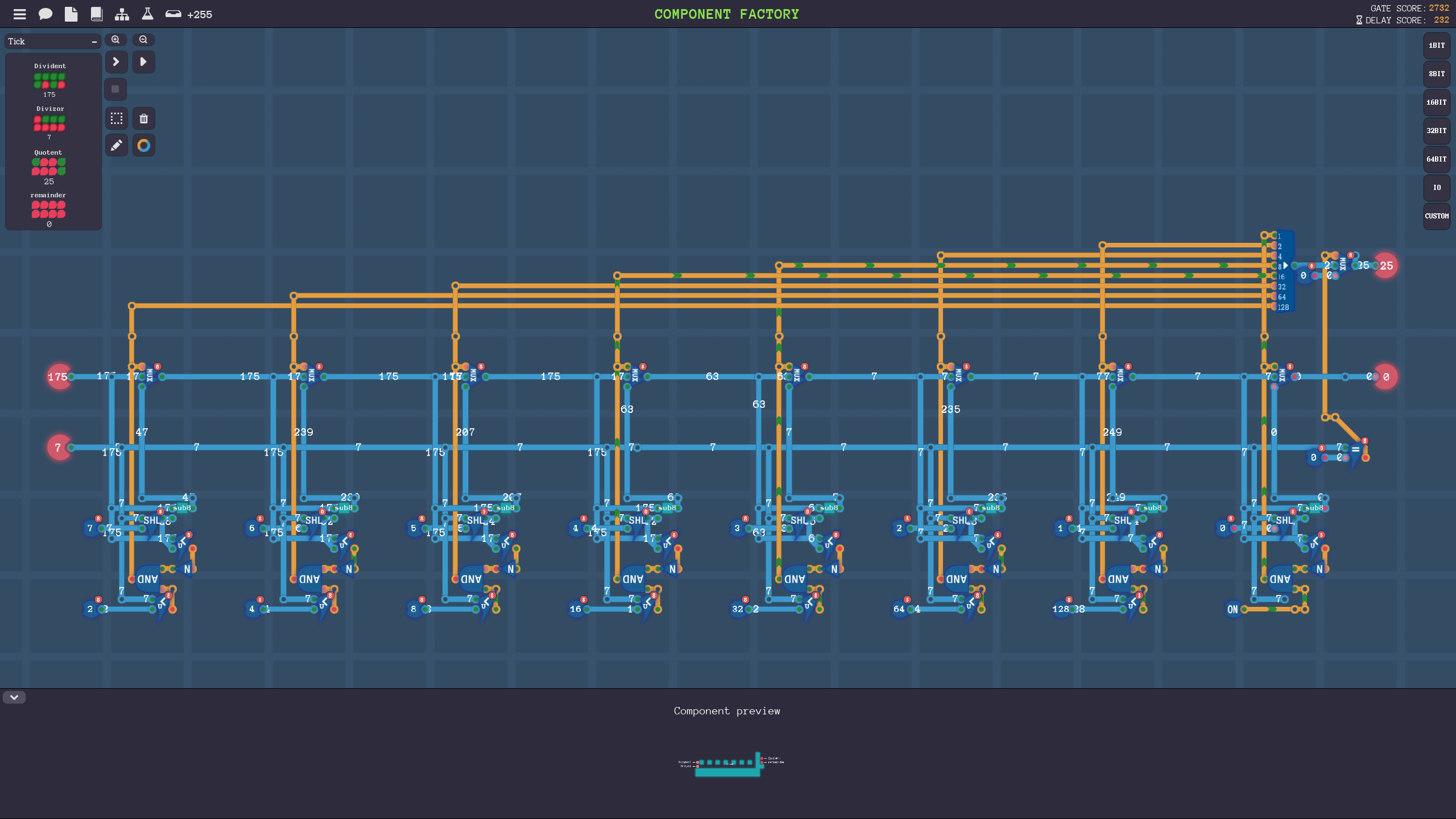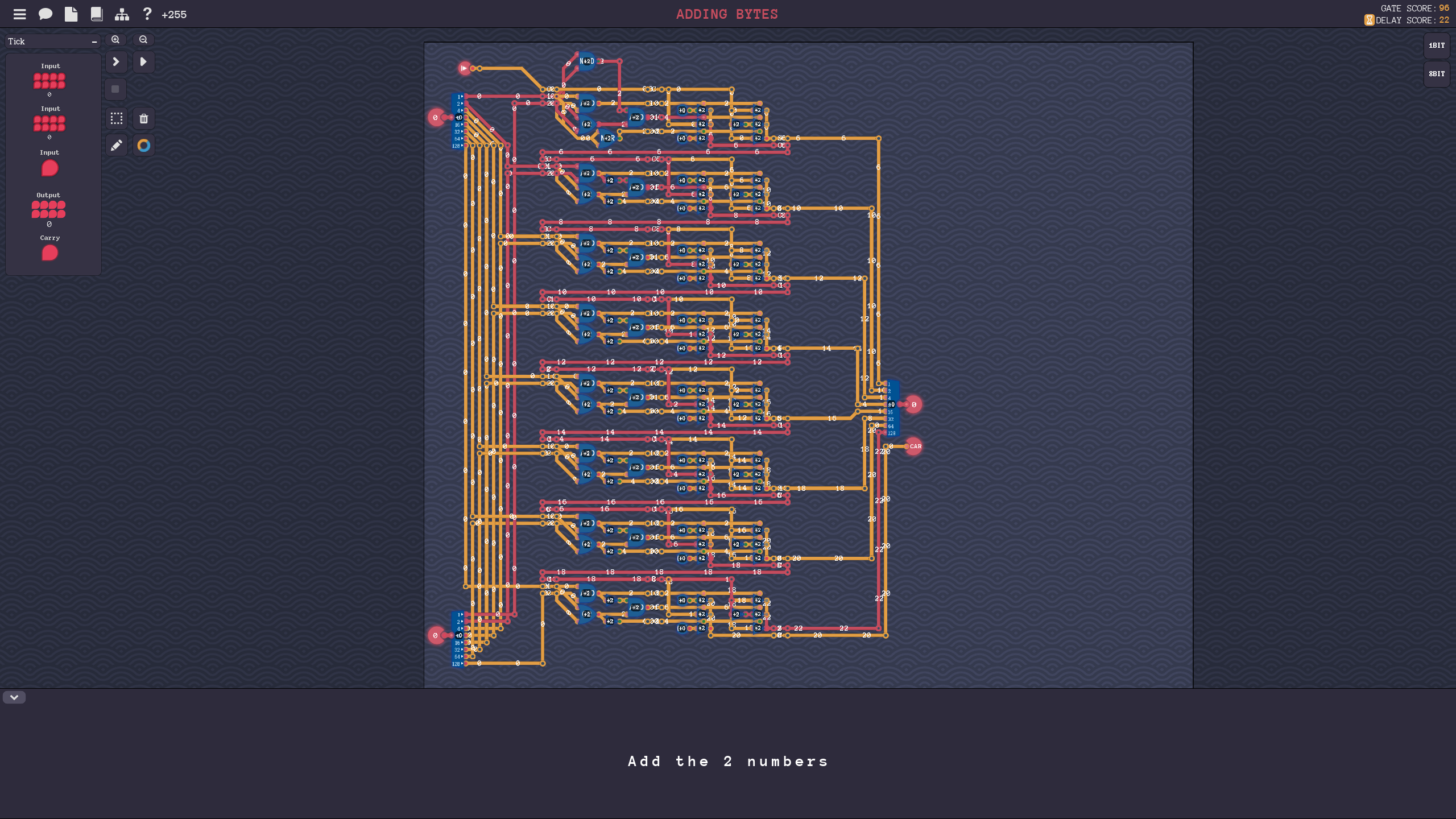 Вдобавок, где-то в середине в игре появляется новая фишка - игра начинает показывать задержки компонентов, и можно заморочиться и попытаться ускорить самый медленный путь в микросхеме. Кроме того, можно вернуться к старым уровням и попробовать ускорить базовые компоненты - тогда все микросхемы, которые их используют, тоже станут быстрее. Например, я смог ускорить сложение двух байт в три раза (до 22, если кто захочет повторить).