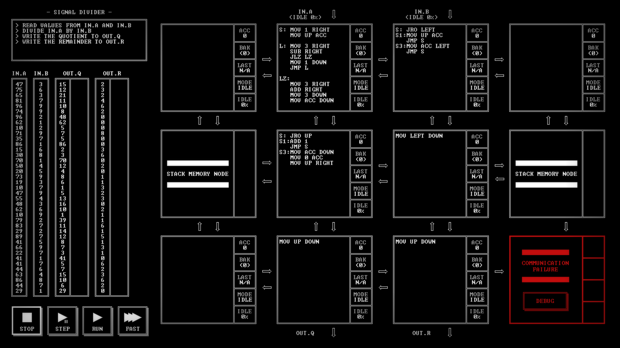 На последних уровнях попадаются довольно жёсткие задачи типа сортировки массива чисел, что в сочетании с очень примитивными вычислителями и ограничениями на размер программы становится серьёзной головоломкой.